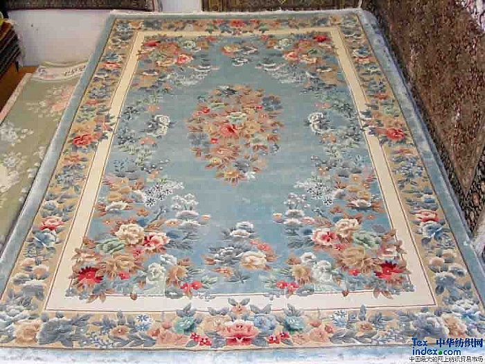 顏色及圖案:天藍色地,白色、粉色花紋圖案,手工編織真絲地毯,可給居室裝潢明亮浪漫的感覺。