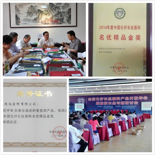 2014-6-23近日,在全國(guó)化纖長(zhǎng)絲面料產(chǎn)品開發(fā)年會(huì)上,悅達(dá)家紡選送的“愛愈濃”新產(chǎn)品,榮獲2014年度中國(guó)化纖長(zhǎng)絲面料名優(yōu)精品金獎(jiǎng)。此次會(huì)議共授予仿真類、運(yùn)動(dòng)休閑類、新型功能類、家紡類、防寒服類等7個(gè)類別名優(yōu)精品金獎(jiǎng)67個(gè)、名優(yōu)精品獎(jiǎng)108個(gè)、入圍獎(jiǎng)42個(gè)。悅達(dá)家紡新產(chǎn)品位列全國(guó)7個(gè)家紡類名優(yōu)精品金獎(jiǎng)產(chǎn)品第三位,...[繼續(xù)閱讀] -